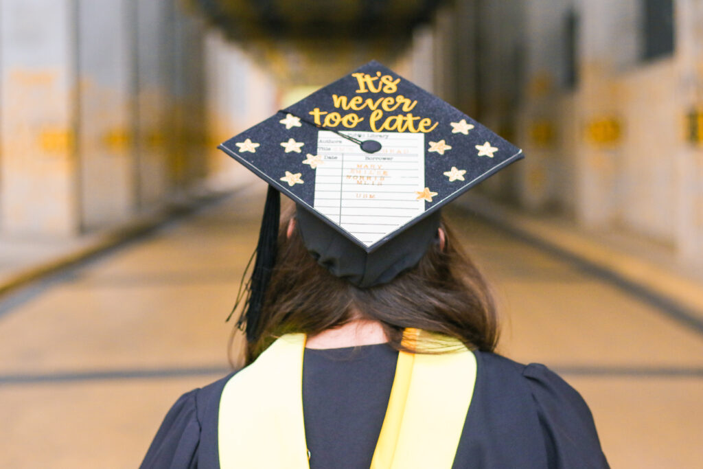 Her graduation cap is adorned with a replica of a library borrowing card stamped with her name and degree, and the quote that carried her through: “It’s never too late.”